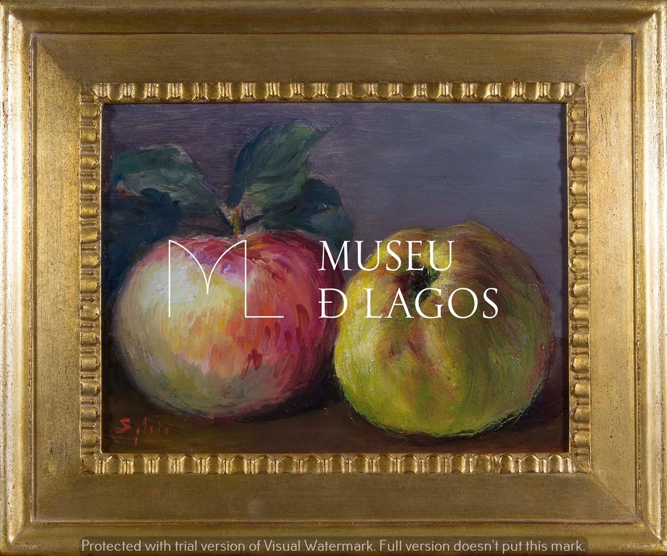 A pintura representa duas maçãs lado a lado, uma delas com algumas folhas e tom rosa, a outra tom verde. A pintura possui a moldura original.