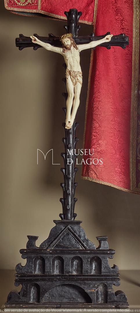 Figuração de Cristo Crucificado com a cabeça um pouco descaída para o lado direito e olhos fechados. O cabelo e barba são um pouco ondeados, possui coroa de espinhos na cabeça e o corpo apresenta sinais de sangue. Traja um cendal atado nas ancas através de uma corda localizada no lado direito. A cruz, de características latinas, apresenta nos rebordos laterais e frontais saliências e encaixa numa peanha de três níveis. No nível inferior, figuram três nichos, um maior ao centro e dois pequenos (um de cada lado). No nível intermédio, figuram quatro nichos pequenos, e na parte superior figura parte relevada em forma de triângulo.