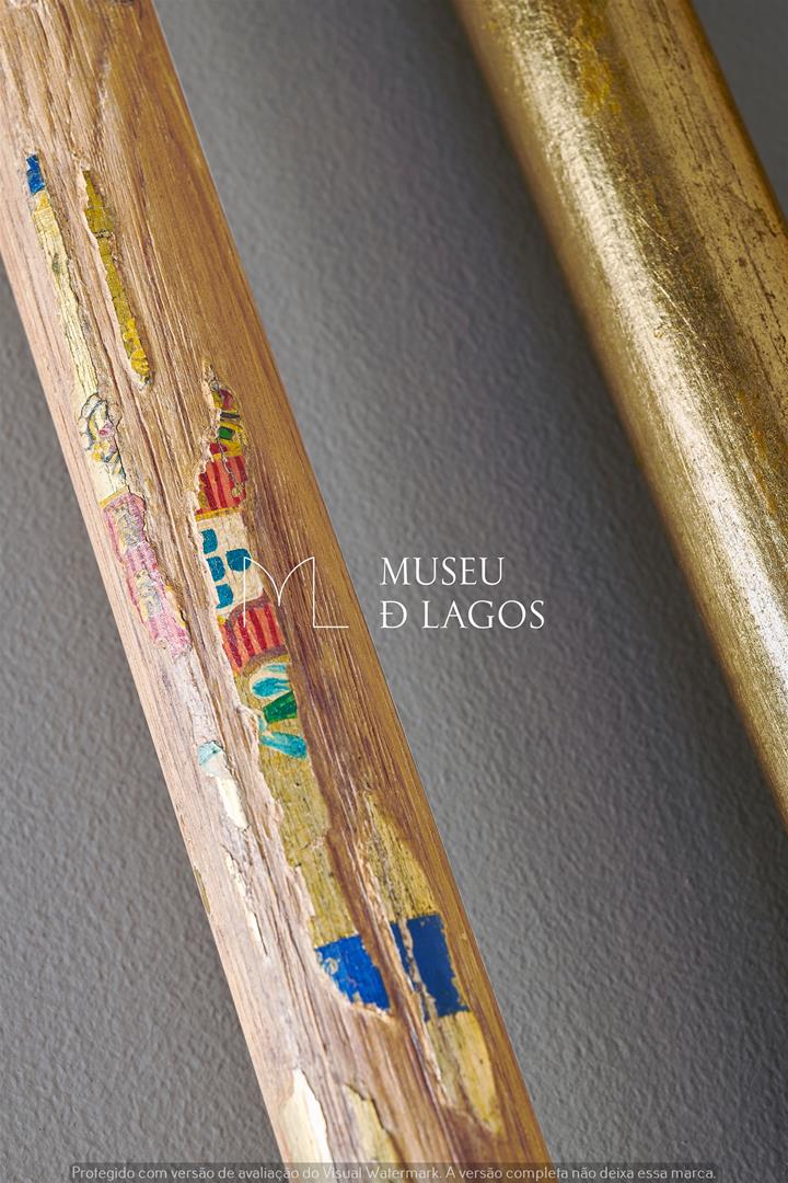 Vara de forma cilíndrica em madeira torneada e rematada, na parte superior em forma semiesférica. Na parte inferior e para proteção da madeira do contacto com o solo e possível desgaste, existe uma peça em bronze dourado. Este remate metálico apresenta decoração com simples elementos côncavos e convexos, sendo rematado em forma semiesférica. A nível decorativo, a peça apresenta um dourado que consiste na aplicação de folha de prata sobre o qual é aplicado um verniz. Sobre este dourado existe uma decoração, embora muito danificada, conserva restos do brasão real de D. João VI.
