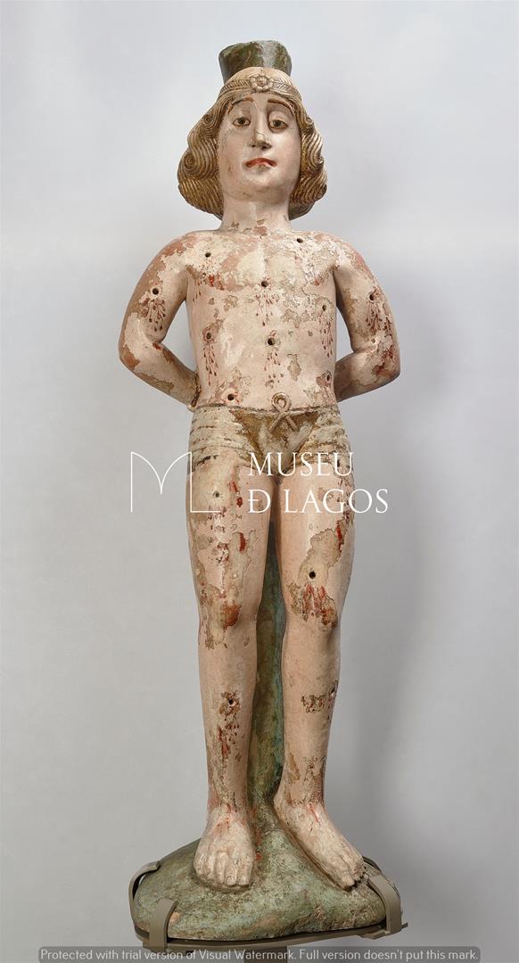 Imagem sobre peanha representando São Sebastião, de corpo inteiro, de pé e em posição frontal. Possui as mãos atadas e braços cruzados atrás das costas presas ao tronco de uma árvore. O santo apresenta expressão serena, cabelo ondeado a partir da fita que os cinge, com decoração floral ao centro. O corpo encontra-se desnudo com um calção curto tapando o baixo ventre apertado com um laço ao centro e várias feridas marcam o seu corpo com vários orifícios. A imagem assenta os pés numa base oval, irregular, possivelmente de uma raiz, entre os pés do santo de onde emerge o tronco da árvore, atrás das costas da imagem.