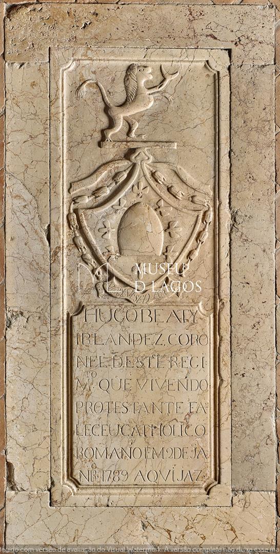 Tampa de sepultura retangular, com moldura dupla e recortada nos cantos interiores. Na metade superior consta o brasão de família dos Beaty: escudo apresenta a parte superior recortada do qual pende duas fitas onduladas, em cada lado, em volta do mesmo uma corrente de flores (túlipas) que seguem desde o topo até ao listel no qual está escrita a divisa: non vi sed arte (não pela força mas sim pela astúcia). Ao centro ostenta a figura de uma colmeia rodeada por abelhas. O Escudo é encimado pela figura de um leão, de perfil, lado direito, com as patas traseiras no chão e afastadas e as dianteiras levantadas segurando um crescente. Por baixo do Brasão de Armas figura a inscrição.